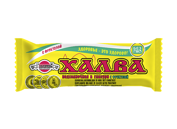 Изделие представляет собой халву подсолнечную в шоколадной глазури ,в виде батончика. Материал этикета - пропилен металлизированный. Упаковка - флоу-пак.